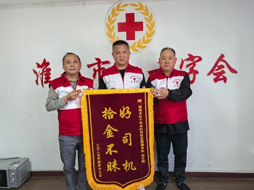 4月14日下午,在淮南市红十字会会议室内,市民王先生(化名,尊重其不愿意透漏真名的意愿)将一面锦旗送到市红十字会好司机志愿服务队队员陈方跃的手里,连声道谢,并为其和服务队点赞,感谢陈方跃师傅将其遗失的公文包和包里的现金、重要资料全部交还于他。这是时隔20多天,该队再次上演的拾金不昧的动人故事。